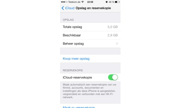 Je kunt iCloud ook gebruiken om een reservekopie te maken van je iPhone of iPad. Ga naar Instellingen / iCloud / Opslag en reservekopie. Zet de schuif achter iCloud-reservekopie aan. Er wordt automatisch een kopie van je foto's, video's, documenten en instellingen gemaakt. Je iPhone of iPad moet wel via wifi verbonden zijn.