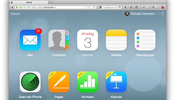 Klik linksboven op iCloud om al je iCloud-gegevens online te bekijken. Hier vind je een ingebouwd mailprogramma en lees je al je gesynchroniseerde notities, herinneringen en agenda's. Ook vind je hier bètaversies van Pages, Numbers en Keynote om online tekstdocumenten, spreadsheets of presentaties te maken en te bewerken.