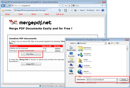 In de praktijk is het samenvoegen van pdf-bestanden handig als u bijvoorbeeld een offerte of werkstuk wilt versturen waarin een gedeelte in Word is gemaakt en een ander gedeelte in Powerpoint. Dit zal voor de meeste mensen geen alledaagse bezigheid zijn. We zijn dan ook blij met de webdienst Mergepdf.net. Extra software installeren is overbodig. Surf naar Mergepdf.net en gebruik de knop Pick files en wijs het eerste pdf-bestand aan. Herhaal dit voor alle bestanden die u wilt toevoegen. Dit kunnen er twee of meer zijn. Klik op Merge pdf om de bestanden samen te voegen. Dit proces kan even duren. Mergepdf.net toont een downloadlink waarmee u de samengevoegde pdf binnenhaalt.