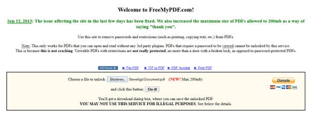 Freemypdf.com valt in de laatste categorie, het wachtwoord wordt volledig verwijderd. Het voordeel van deze dienst is dat het online is, en het dus niet gebonden is aan een platform. De maximumgrootte die je kunt uploaden is 200 MB (daar heb je uiteraard wel een aardige internetverbinding voor nodig dan).
