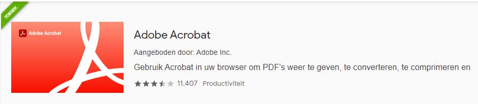 De nieuwe Adobe Acrobat-extensie haal je uit de webstores van Chrome en Edge op. Voor Chrome doe je dat via https://kwikr.nl/aach en voor Edge doe je dat via https://kwikr.nl/aaed. Nadat je de toevoeging hebt geïnstalleerd, moet je de extensie inschakelen en instellen als de standaardtool voor pdf. Als je daarna op een directe pdf-link klinkt of als je in de browser een pdf-document opent, zal Acrobats plug-in gebruikt worden. De extensie vraagt toestemming om gegevens op de website te lezen en te wijzigen. Dat is niet ongebruikelijk, anders kan de tool zijn werk niet doen.