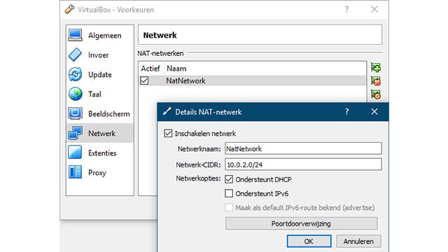 Open ook de rubriek Netwerk, waar je vastlegt hoe de virtuele machines met elkaar communiceren. Op het tabblad NAT-netwerken klik je de groene plusknop aan en dubbelklik je vervolgens op het toegevoegde item. Hier kun je als je wilt de naam (NatNetwork), de Netwerk CIDR (10.0.2.0./24) en enkele netwerkopties wijzigen. Je kunt echter ook gewoon de standaardkeuzes gebruiken, inclusief dhcp-ondersteuning. Zorg wel dat er een vinkje staat bij Inschakelen netwerk en bevestig je keuzes.