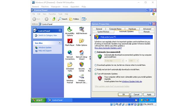 Bij Windows XP en 7 doe je er wel goed aan de functie automatische updates meteen na de eerste opstart uit te schakelen, want voor onze experimenten zijn we juist geïnteresseerd in ongepatchte systemen. Dat kan via het Windows Configuratiescherm (Control Panel) in Classic View, waarna je bij System het tabblad Automatic Updates opent en Turn Off Automatic Updates selecteert.