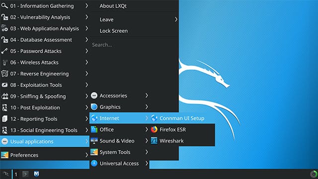 Alles is nu in gereedheid om met Kali aan de slag te gaan. Zoals gezegd bevat Kali enkele honderden pentesting-tools en die vind je op het bureaublad overzichtelijk gerubriceerd onder het menu Applications.