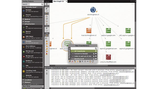Beginnen we met de rubriek Infrastructure, waar je de Domain-functie naar het canvas versleept. Dubbelklik op het toegevoegde item en vul de beoogde domeinnaam in. Vervolgens rechtsklik je op het item: je krijgt nu de beschikbare transforms te zien. Via het knopje Configure kun je individuele taken aanpassen en verwijderen, maar je kunt in één keer ook Run All kiezen, bijvoorbeeld bij het onderdeel DNS from Domain. Het resultaat, zowel tekstueel als grafisch, laat niet lang op zich wachten: je krijgt onder meer alle websites, nameservers en mailservers van dat domein te zien. Je kunt echter ook rechtsklikken op elk van deze subitems om nog meer details op te vragen. Het is tevens mogelijk de grafiek te bewaren en te delen.
