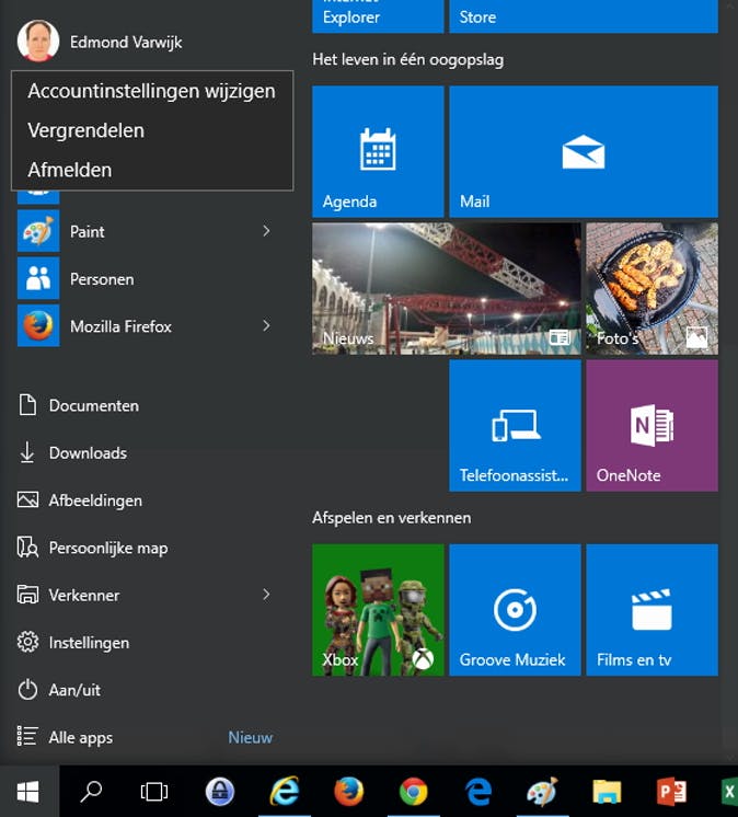 Veel van deze koppelingen zijn live-tegels: grote vlakken die live-informatie geven uit de app en die regelmatig worden ververst. Zet je de muis boven het rechterdeel van het menu, dan wordt aan de rechterkant een verticale scrolbalk zichtbaar. Hiermee kun je omhoog en omlaag bewegen om andere groepen programma's te zien. Tot slot, helemaal linksboven zie je een afbeelding en jouw loginnaam. Klik erop voor Afmelden, Vergrendelen en het aanpassen van Accountinstellingen.