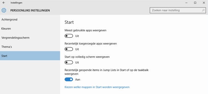 De onderdelen in de linkerkolom van het startmenu laten zich via de instellingen uitschakelen.