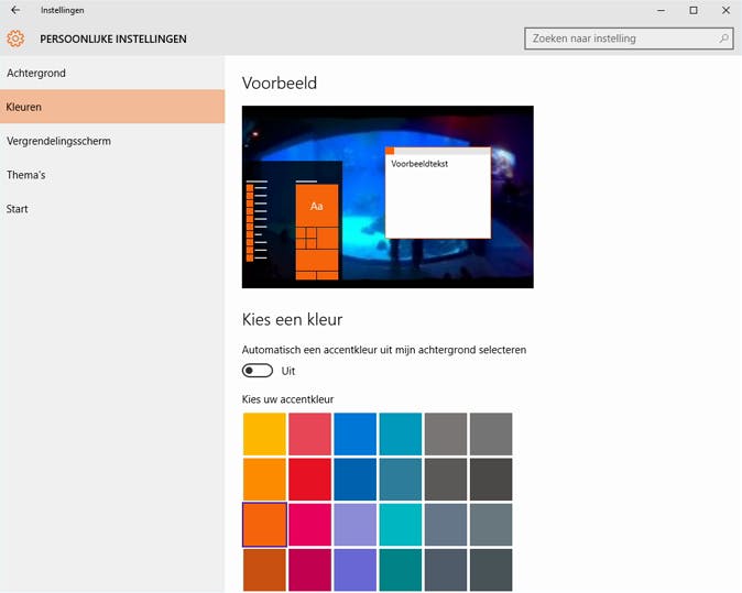Vind je blauw niet mooi, geef het menu dan een andere kleur. Klik op Start / Instellingen / Persoonlijke instellingen en klik op Kleuren. Je kunt hier zelf een kleur kiezen uit het kleurenpalet of je kunt Windows een slimme kleur laten kiezen bij de achtergrond van jouw Bureaublad door de optie Automatisch een accentkleur uit mijn achtergrond selecteren in te schakelen. De wijzigingen worden direct doorgevoerd.