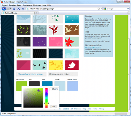 Naast de achtergrondafbeelding, kunt u ook nog de achtergrond van de twitterberichten, de tekstkleur, links, sidebar en de rand van de sidebar aanpassen. Klik hiervoor op Change design colors. Klik onderaan op een vierkantje om de kleurkiezer tevoorschijn te toveren en kies een kleur. Ook kunt u hier weer eventueel de html-kleurcode ingeven. Als u een kleur kiest, ziet u dit direct in het design van de pagina terug. Klik steeds op OK om een kleur te selecteren. Klik op save changes als u tevreden bent over uw design.