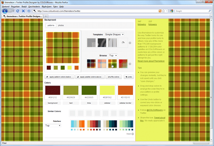 Hoewel u dus via Twitter.com al redelijk eenvoudig uw design aan kunt passen, is het nóg makkelijker om de nieuwe service Themeleon te gebruiken. Ga naar colourlovers, login met uw Twitteraccount (klik op Login to Twitter en daarna op Allow). Hierna kunt u kiezen uit honderdduizenden achtergrondpatronen en meer dan een miljoen kleurpaletten, die u nog verder naar eigen wens kunt aanpassen.