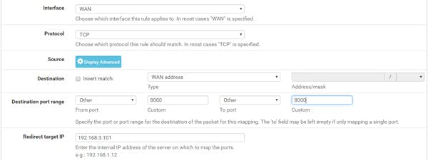 Stel, je hebt op een systeem binnen je netwerk een webserver draaien op poort 8000, dan maak je deze instellingen: Interface – WAN, Protocol – TCP, Destination – WAN address, Destination Port Range from Port other / 8000 To port other / 8000. Bij Redirect target IP vul je het interne IP-adres van je webserver in (bijvoorbeeld 192.168.1.101) en Redirect target Port geef je Other / 8000 mee. Nog even een geschikte beschrijving invullen en opslaan.