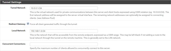 Wil je dat alle verkeer via de VPN-tunnel gaat zodra een gebruiker connectie heeft gemaakt met je VPN-server, plaats in de rubriek Redirect Gateway dan een vinkje bij Force all client generated traffic through the tunnel. Tenzij je specifieke redenen hebt, laat je Interface, Protocol en Local Port ingesteld op de standaardwaarden, respectievelijk WAN, UDP en 1194.