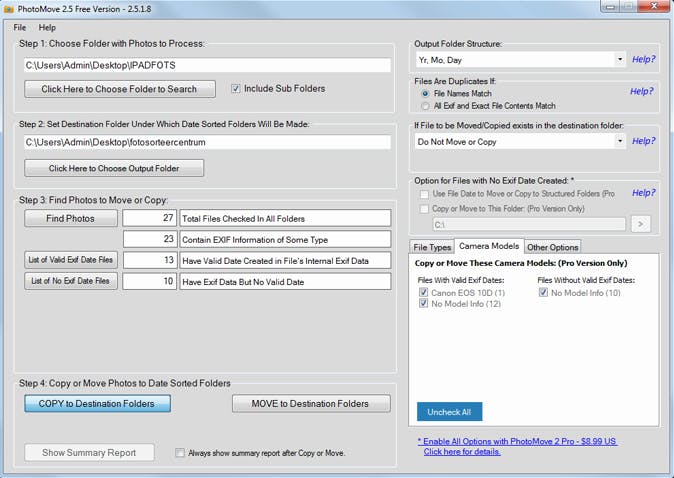 Logischerwijze geef je eerst aan welke (foto)map je wilt verwerken (al dan niet inclusief submappen) en in welke map je de bestanden op een geordende manier wilt laten terechtkomen. Jammer is dat PhotoMove geen UNC-paden (zoals \\mijnnas\fotos) ondersteunt. Verder geef je aan hoe de uiteindelijke structuur van de uitvoermap er moet uitzien. Je keuze is in de gratis versie wel beperkt tot twee mogelijke structuren: ofwel Yr, Mo, Day (jaar, maand en dag waarop de foto werd genomen) ofwel Yr, Mo, Day, Cameramodel. De betaalde Pro-versie van de tool (weliswaar slechts circa 8 euro) laat wel andere combinaties toe. Deze informatie haalt PhotoMove uit de EXIF-data, die in de meeste digitale foto's ligt opgeslagen.