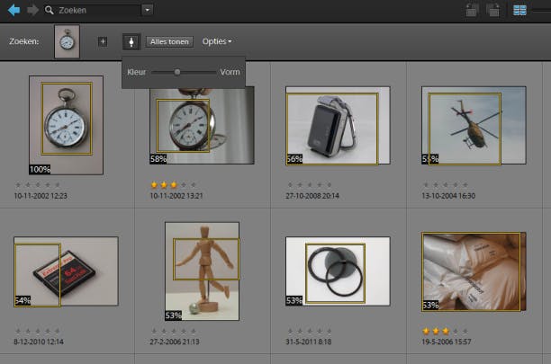 Koopt u Photoshop Elements, dan zit daar meteen een fotobeheerder genaamd 'de Organizer' bij. Nieuw is dat u met deze Organizer kunt zoeken naar objecten. U trekt een kadertje om een voorwerp (of dier) en daarna wordt een poging gedaan dit object en alles wat er op lijkt in uw fotoverzameling op te sporen. Een soort gezichtsdetectie dus (dat zit er al veel langer in), maar dan eentje die ook werkt als er geen mensen in beeld zijn. Er worden erg veel foto's gevonden die ogenschijnlijk geen enkel verband hebben met het gezochte object. Het werkt dus verre van perfect. Deze mogelijkheid kan een moeizame zoektocht in grote fotoverzamelingen flink versnellen, dus hopelijk wordt deze techniek (op korte termijn) verfijnd.