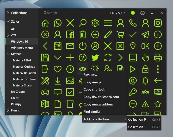 Op de thuisbasis van Icons8 vind je de link naar de Microsoft Store om Pichon te downloaden. Met deze app heb je volledige toegang tot de bibliotheek van meer dan 135.000 pictogrammen zonder gebruik te maken van het internet. De grafische bestanden die je selecteert, mag je gratis gebruiken, op voorwaarde dat je verwijst naar Icons8.