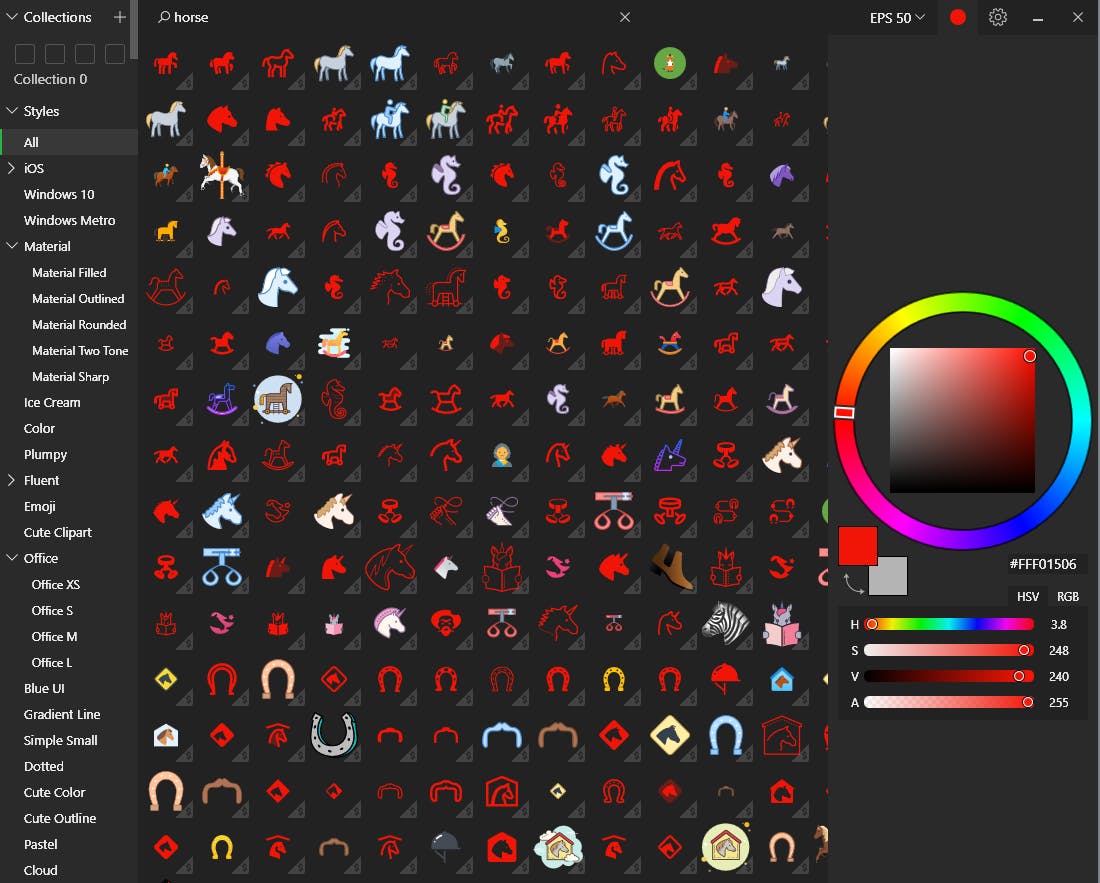 Bij de installatie haal je de volledige pictogramdatabase (753 MB of 169.625 icoontjes) naar de harde schijf die je opent vanuit het systeemvak. Je bepaalt zelf hoeveel pictogrammen je in beeld krijgt door de grootte van het basisvenster aan te passen. In dit venster blader je door de inhoud op basis van verschillende categorieën zoals Hand Drawn, Emoji of iOS. En natuurlijk kun je meer gericht zoeken met zoekwoorden in het Engels.
