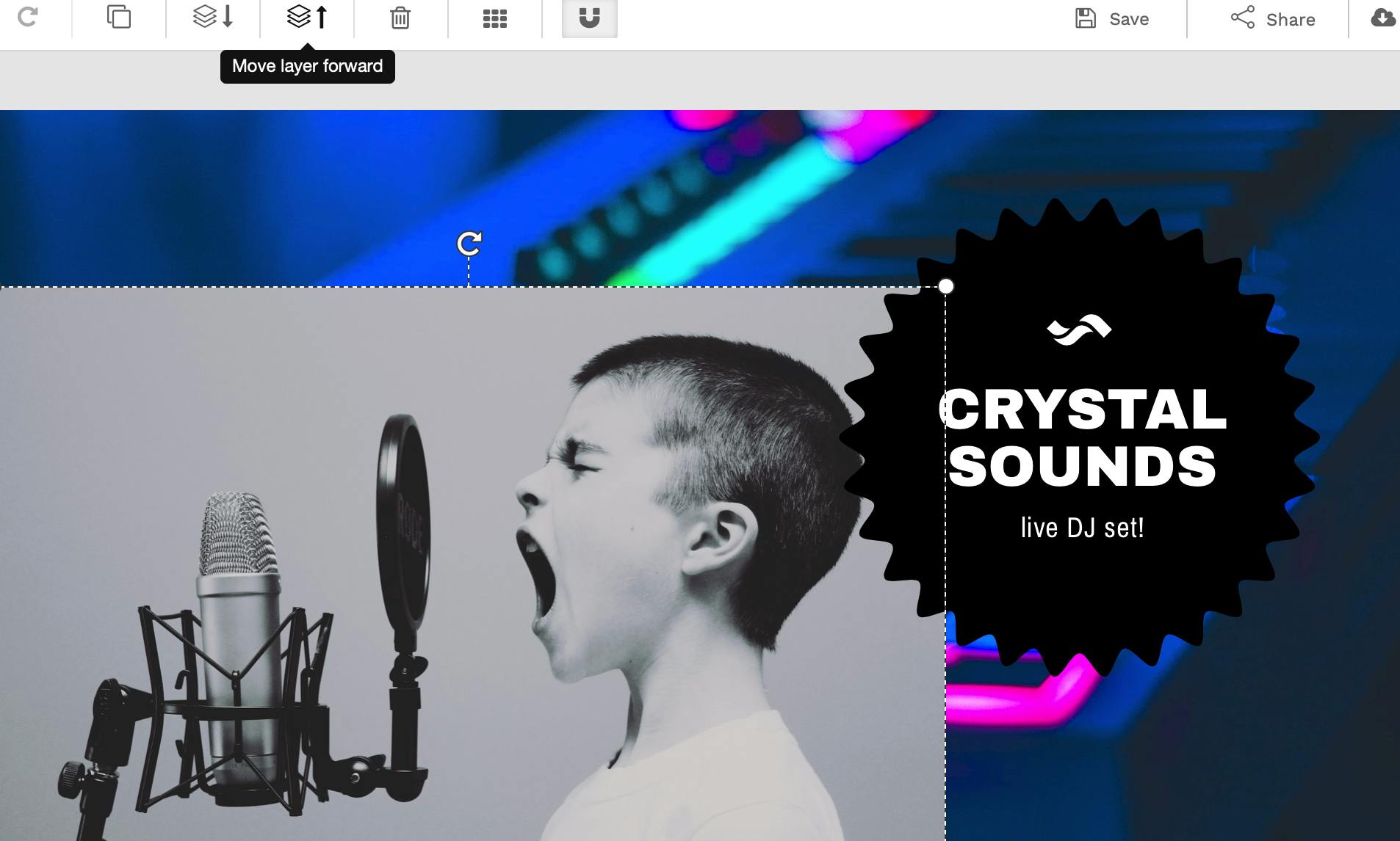 Alle elementen die je in het ontwerp gebruikt, komen terecht op lagen. Merk je dat een tekst plotseling achter een afbeelding is verdwenen, dan betekent dit meestal dat de tekstlaag zich achter de afbeeldingslaag bevindt. Je kunt dit verhelpen door de bovenliggende laag naar achteren te verplaatsen. Selecteer dan de laag met de afbeelding en klik op de knop Move layer back. Je kunt ook de onderliggende laag selecteren en dan de knop Move layer forward gebruiken. Soms is het nodig dat je enkele keren op een van deze knoppen klikt. Er staat in de knoppenbalk ook een knop Duplicate layer, waarmee je de laaginhoud met één muisklik dupliceert.