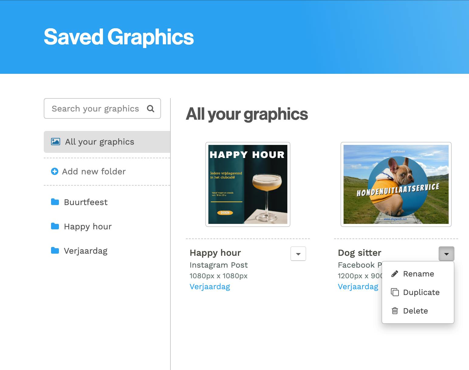 Via de knop Menu is het niet alleen mogelijk om een nieuw project te beginnen met de opdracht Create a Graphic. Je kunt ook naar alle opgeslagen ontwerpen. In de weergave Saved Graphics is het trouwens mogelijk om mappen te maken om je projecten te organiseren. Wanneer je een ontwerp op zo’n map sleept, zul je zien dat onder het miniatuur de naam van deze map verschijnt. Als je op deze mapnaam klikt, dan krijg je uitsluitend de graphics te zien die bij deze map horen. Om weer alle ontwerpen te zien, klik je op All your graphics. Deze mappen werken dus zoals labels of tags. Wil je een graphic verwijderen, dan klik je in de weergave Saved Graphics op het pijltje onder het miniatuur en kies je de opdracht Delete.