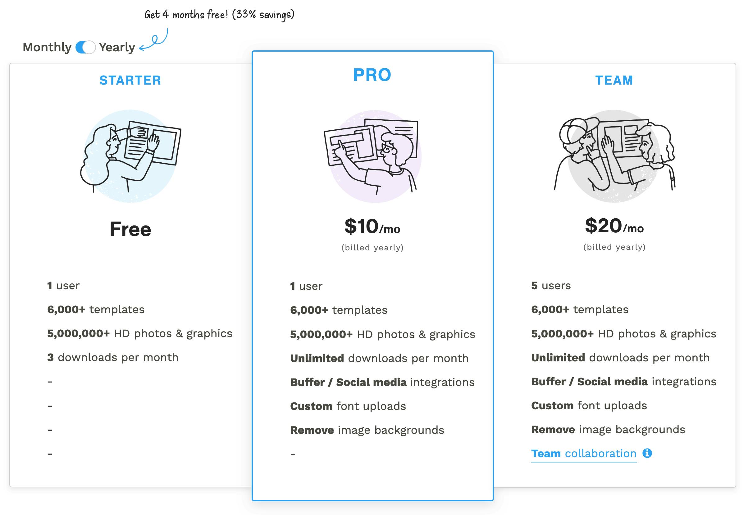 Snappa heeft verschillende abonnementen. We raden aan te beginnen met de gratis formule. Op die manier kun je het programma alvast in de vingers krijgen en kun je al doende ervaren of het aan je verwachtingen voldoet. Dat betekent dat je jezelf registreert met je e-mailadres en een wachtwoord. Even later ontvang je een mailtje waar je op de bevestigingslink klikt en daarna is het Starter-account actief. Hiermee heb je toegang tot meer dan zesduizend sjablonen en meer dan vijf miljoen HD-afbeeldingen. Het gratis abonnement staat slechts drie downloads per maand toe. Met een pro-account, dat je tien dollar per maand kost, heb je toegang tot hetzelfde aantal sjablonen en afbeeldingen, maar mag je ze onbeperkt downloaden. Bovendien beschik je dan over een mogelijkheid om de achtergrond van foto’s te verwijderen.