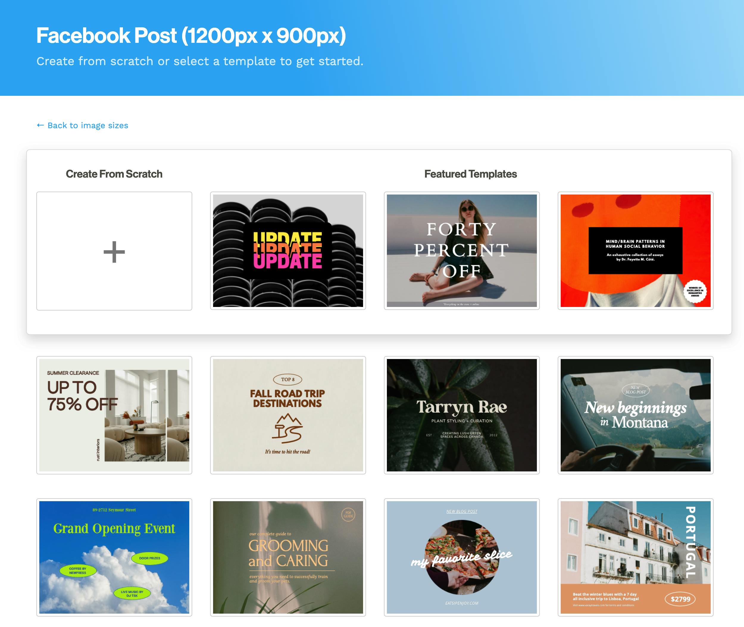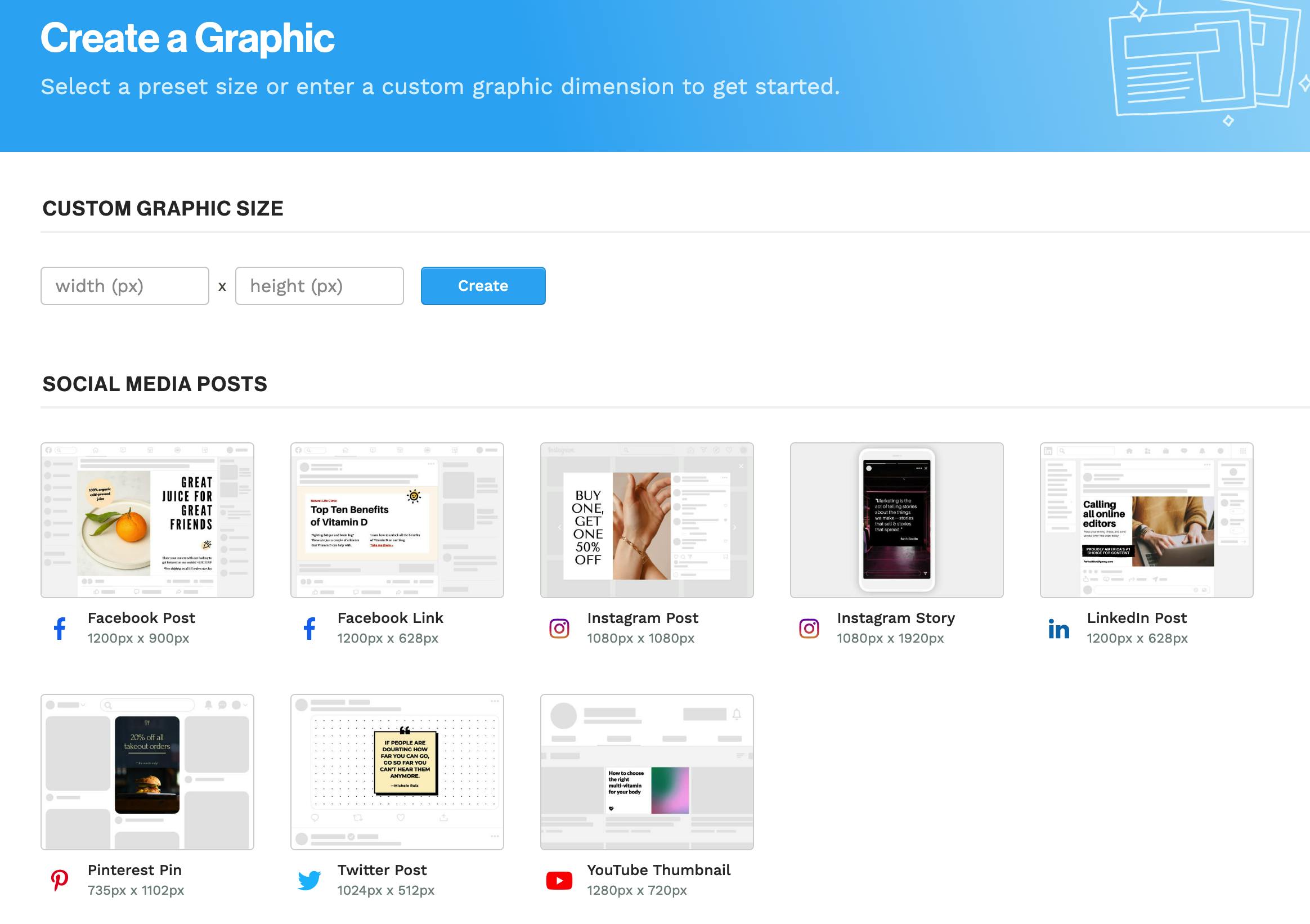 Eigenlijk hoef je nooit van nul te beginnen. In plaats van naar een leeg canvas te staren, gebruik je beter een van de duizenden kant-en-klare ontwerpsjablonen die er stuk voor stuk professioneel uitzien. Nadat je bent ingelogd, kom je op de pagina Create a Graphic. Hier kun je zelf een waarde ingeven voor de breedte en hoogte, maar de meeste gebruikers zullen kiezen voor de thema’s die je hier aantreft voor sociale media, blogs, infographics, e-bookcovers en meer … Laten we bijvoorbeeld beginnen met een Facebook Post, die bij Snappa 1200 × 900 pixels meet.