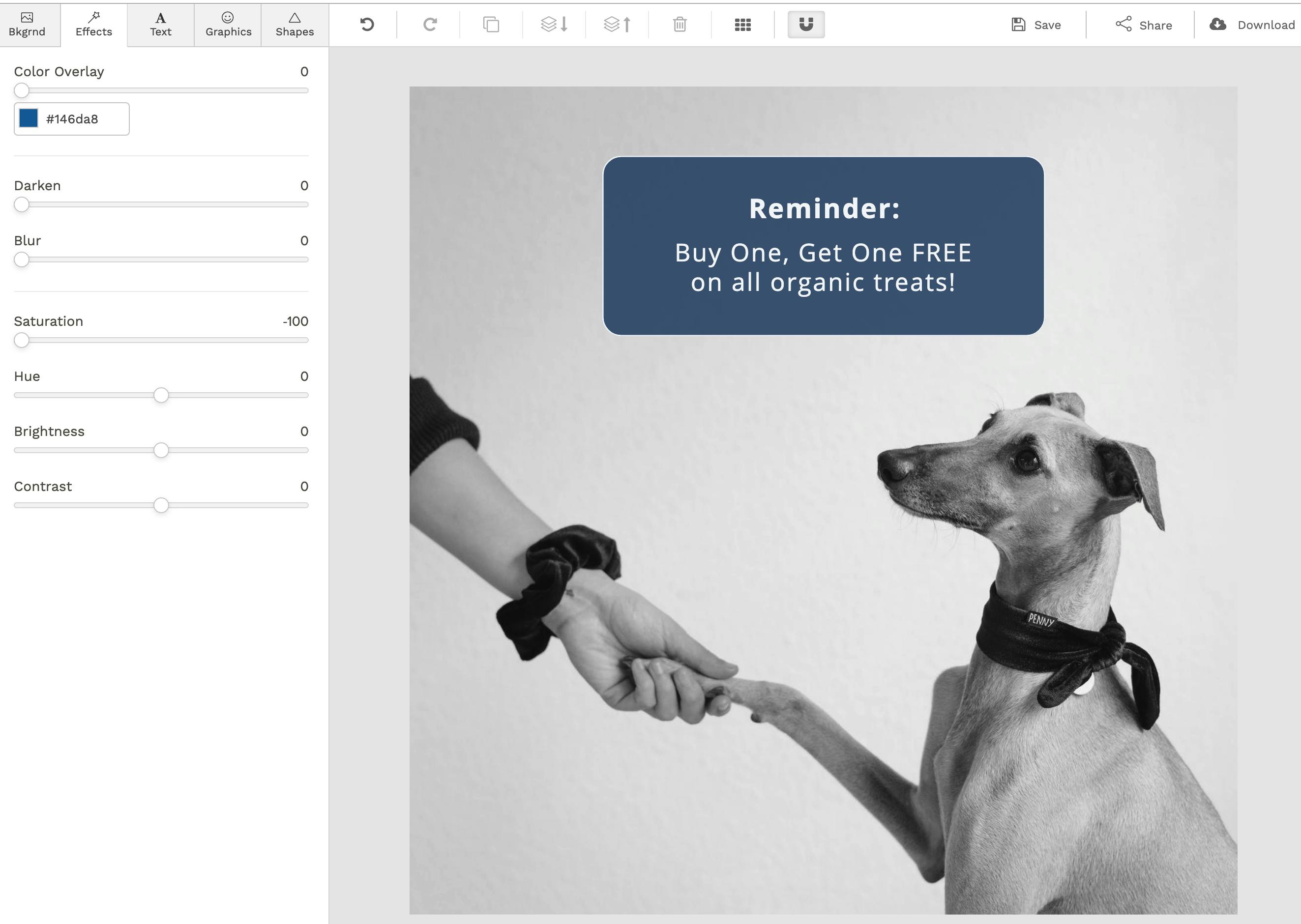 Als je de regelaar Saturation naar rechts sleept, worden de kleuren van de achtergrond levendiger. Zet je de Saturation op -100, dan verandert die afbeelding in zwart-wit). Daarnaast kun je ook nog de kleurtoon (Hue), helderheid (Brightness) en contrast (Contrast) aanpassen. Snappa houdt de gekozen instellingen vast. Dat betekent als je later voor dit project een andere achtergrond zou kiezen, dezelfde effecten automatisch op de nieuwe afbeelding worden toegepast.
