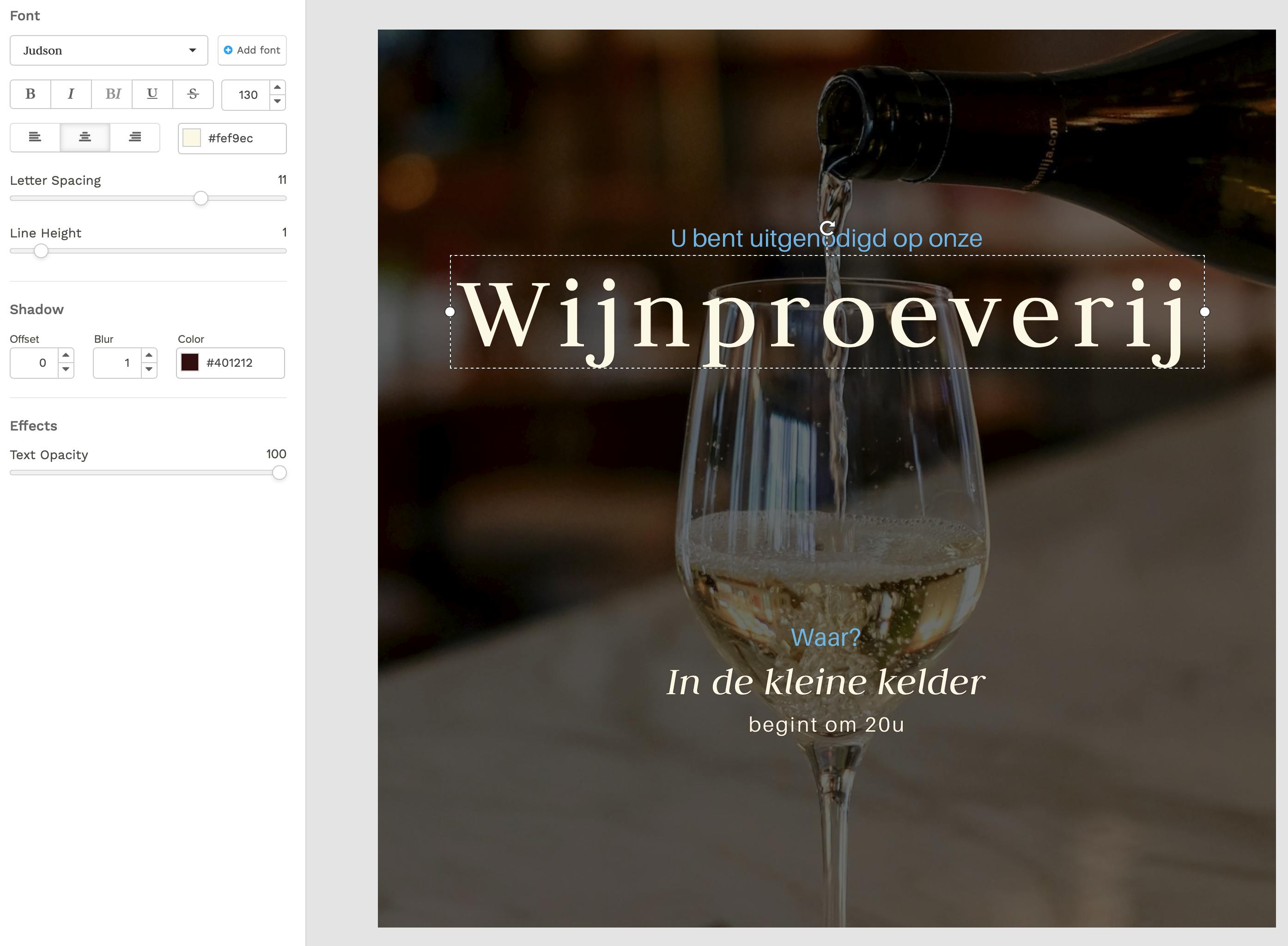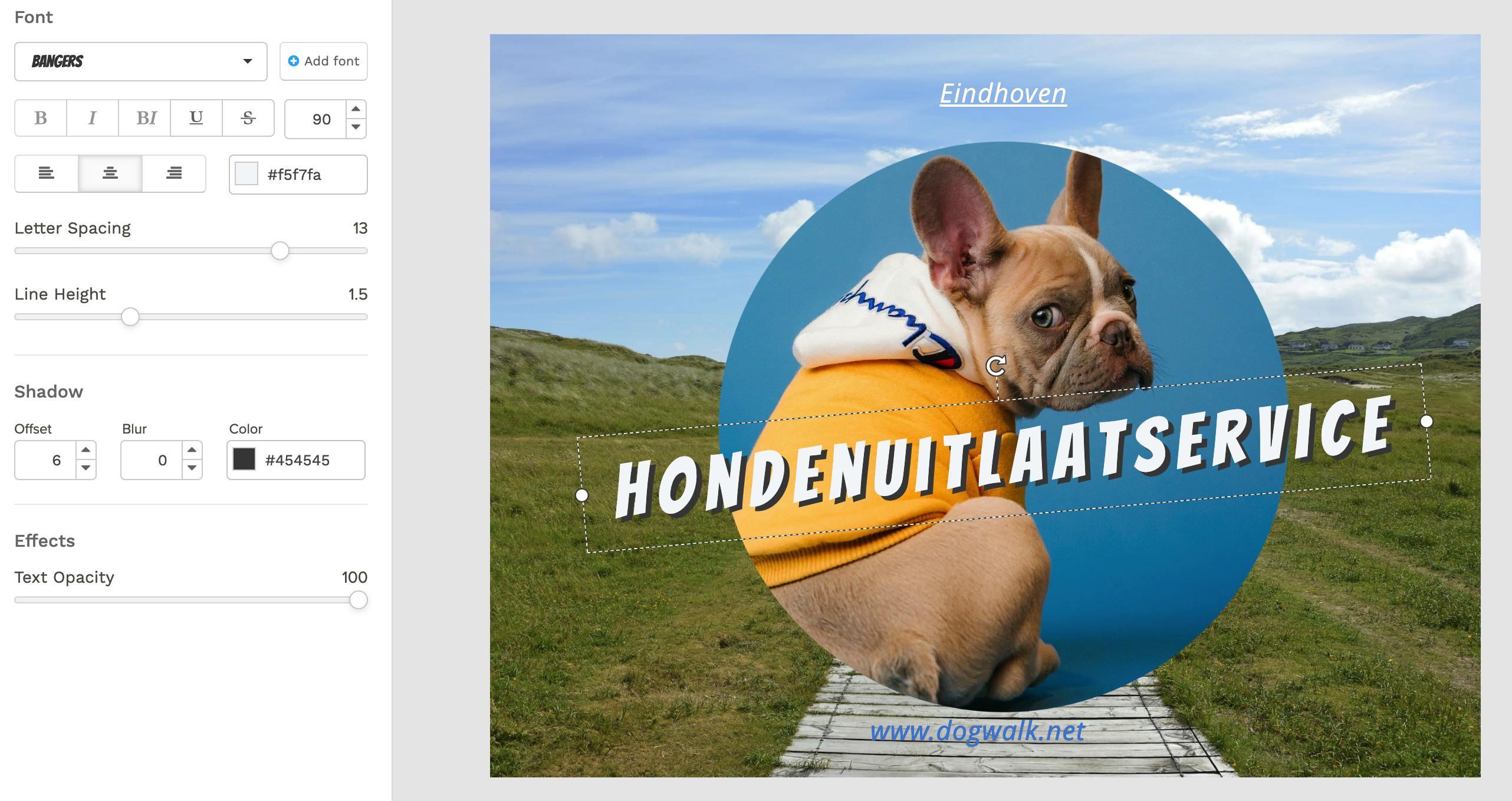 Je kiest een lettertype, lettergrootte, stijl, kleur en uitlijning. Tegelijk regel je de afstand tussen de letters met het schuifje Letter Spacing. Hiermee kun je titels nauwkeurig spreiden over het design. Om de tekst hoger of lager in het tekstvak te positioneren, gebruik je de regelaar Line Height. Bovendien kun je het tekstvak zelf ook een achtergrondkleur geven. Tekst op een achtergrondfoto is soms moeilijk leesbaar, bijvoorbeeld als de tekstkleur wit is terwijl de achtergrond heldere zones bevat. Dit verhelp je door een zachte slagschaduw onder de tekst te plaatsen. Bij Shadow kies je de offset van de schaduw en de vervaging. Ten slotte is het zelfs mogelijk om de dekking van de tekst aan te passen en de tekst te roteren.