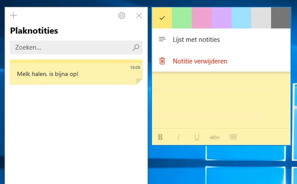 Het gebruik van Sticky Notes spreekt redelijk voor zichzelf. Gemakshalve is zoals je ziet alvast een exemplaar voor je klaargezet. Je kunt hier naar hartenlust in tikken. De knoppen onderaan de notitie zorgen voor vette, schuine, onderstreepte en/of doorgehaalde tekst. Middels het meest rechtse knopje onderaan het blaadje maak je in een handomdraai een puntenlijst. Bevalt het standaard geel van het blaadje je niet, klik dan eens op de knop met de drie puntjes rechtsboven. Je kunt nu uit diverse pastelkleuren kiezen! Om een nieuw blaadje toe te voegen klik je in het hoofdvenstertje van Sticky Notes op de +. Of klik op de + op een willekeurig notitieblaadje als je dat hoofdvenster al gesloten had. Om het hoofdvenster weer te openen klik je simpelweg met de rechter muisknop op het pictogram van Sticky Notes, te vinden in de balk Snel starten links onder in beeld. Klik dan op Lijst met notities en daar is het venster weer. Om iets aan de (weinige) instellingen te wijzigen klik je op het instellingentandwiel. Check daar of in ieder geval de optie Inzichten inschakelen uit staat. Daarmee voorkom je dat de inhoud van je notities doorgestuurd wordt naar Bing en Microsoft. Verder geldt dat je Sticky Notes een herstart of afsluiten van het systeem ook overleven. Na opnieuw inloggen zie je ze direct weer op het bureaublad staan. Mocht dat onverhoopt eens een keer niet het geval zijn, of heb je Sticky Notes al dan niet per ongeluk afgesloten? Start de app dan gewoon weer vanuit het menu Start en het probleem is al opgelost. Verder geldt dat je via het afsluitkruisje een notitie kunt sluiten. Daarmee is ie nog niet écht weg. In het hoofdvenster met de lijst aan notities zie je hem nog staan. Echt weggooien doe je door daar op het prullenbakje van de betreffende notitie te klikken en deze actie te bevestigen.