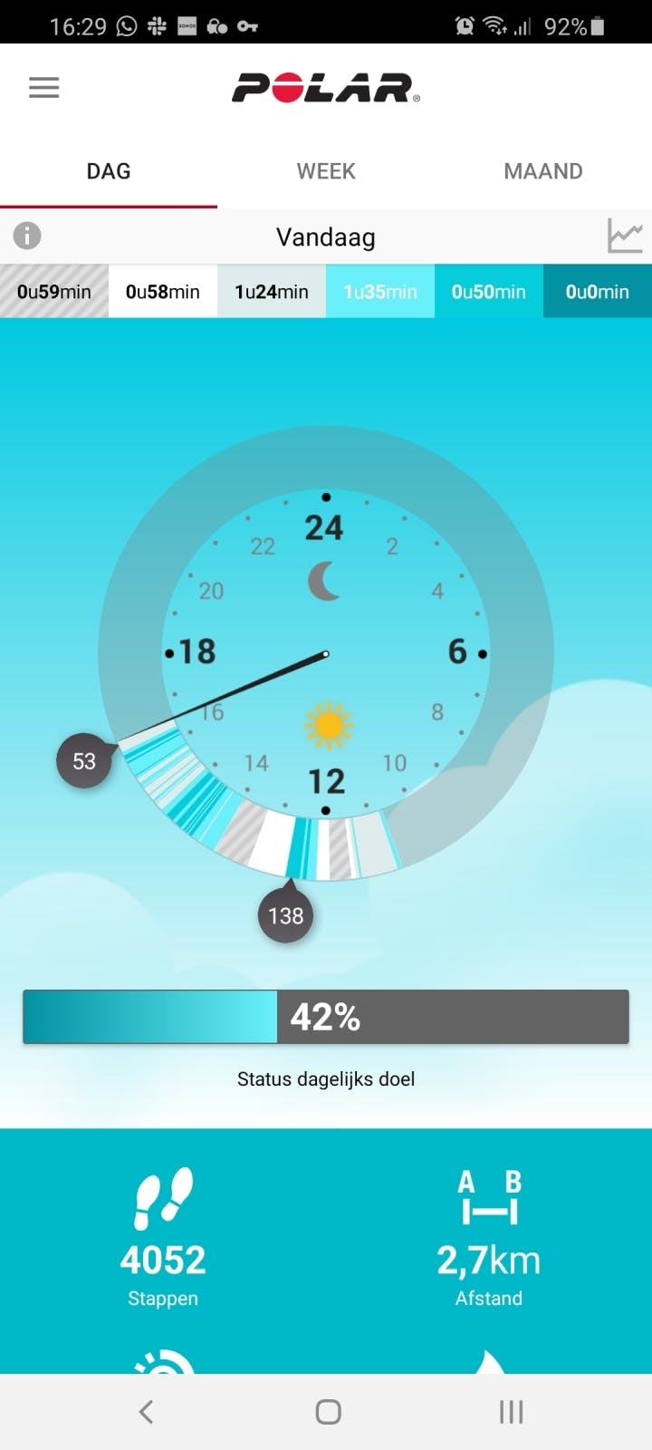 De verzamelde gegevens kun je inzien op het horloge zelf of in de app. In de Polar Flow app kun je natuurlijk veel beter de gegevens op lange termijn inzien. Fijn is ook dat je andere diensten aan Polar koppelt, je gegevens zitten niet vast in de Polar-app zoals dat met Fitbit het geval is.