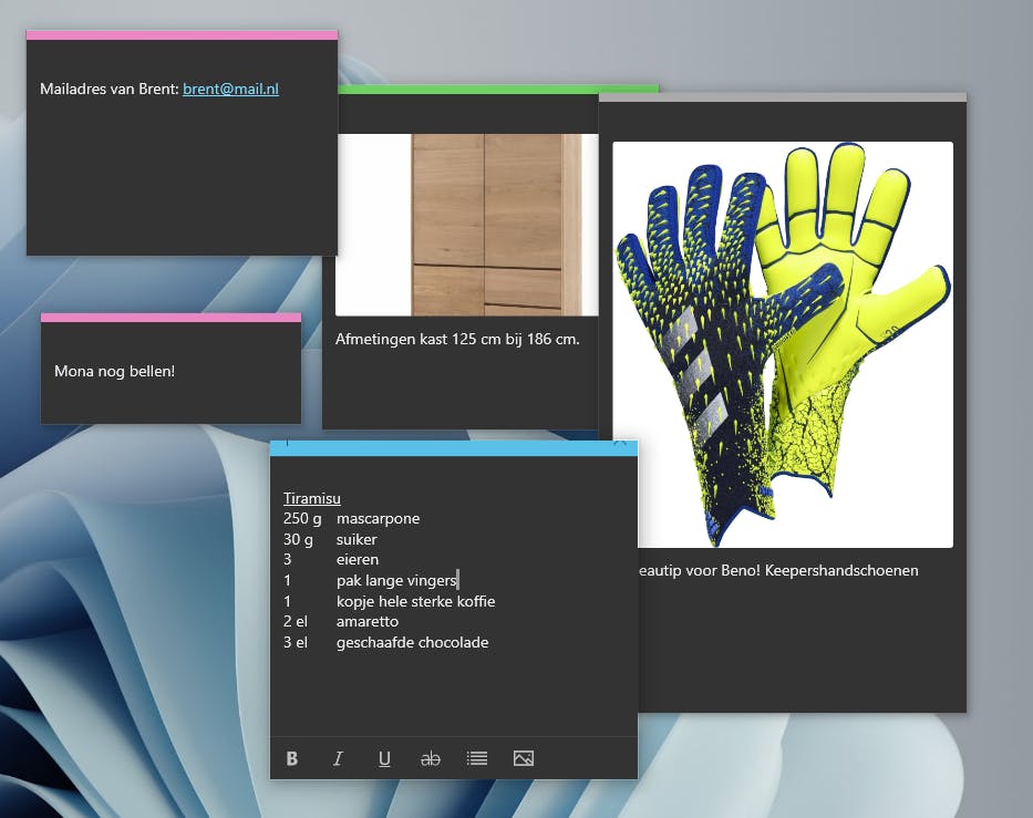 Wanneer je een nieuwe plaknotitie maakt, verschijnt die naast de vorige notities. Je past het formaat aan door op de rand van de notities te klikken en deze te slepen. Je kunt ook notities stapelen om ruimte op het bureaublad te besparen. Het is niet mogelijk om Plaknotities boven alle andere toepassingen bij te houden. Als je een schoon bureaublad wilt dan kun je een volledige aparte plaknotitie-desktop maken. Hiervoor druk je op Windows-toets+Tab om Windows 10 Taakweergave te openen en virtuele bureaubladen te maken. Vervolgens klik je op Nieuw bureaublad bovenaan het scherm. Door memo’s op het tweede bureaublad te slepen voorkom je dat de hoofdwerkruimte rommelig oogt. Wanneer je klaar bent, druk je terug op Windows-toets+Tab en selecteer je het eerste bureaublad. Met de sneltoets Ctrl+Windows-toets+PijltjeLinks en Ctrl+Windows-toets+PijltjeRechts schakel je eenvoudig tussen de desktops.
