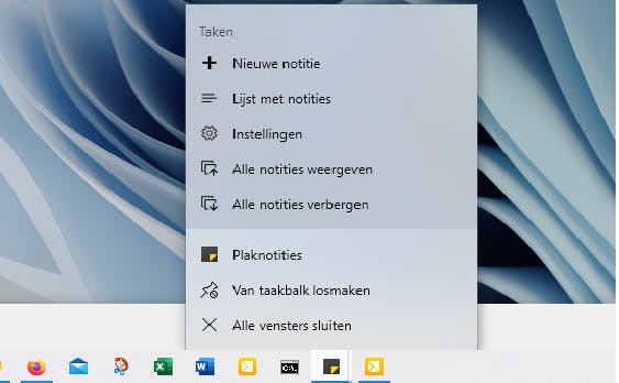 Als er een programma is waarbij we aanraden om het vast te maken in de taakbalk dan is het Plaknotities. Op die manier heb je het altijd binnen handbereik. Heb je het programma geopend, dan klik je met de rechtermuisknop op het pictogram in de taakbalk en kies je Aan taakbalk vastmaken. Vanaf daar open en verberg je alle notities met de rechtermuisknop en maak je snel een nieuwe notitie. Vanuit de taakbalk ga je ook sneller naar de instellingen van het programma. Anders moet je eerst vanuit een geopende plaknotitie naar de lijst met plaknotities gaan om daar in de rechterbovenhoek de instellingen te vinden.