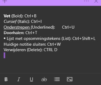 In plaats van de knoppen onderaan, kun je natuurlijk ook sneltoetsen gebruiken. Die sneltoetsen komen grotendeels overeen met die van Microsoft Word. Ze zijn ook makkelijk te onthouden. Selecteer de tekst en gebruik dan een van de sneltoetsen: Vet (Bold): Ctrl+B Cursief (Italic): Ctrl+I Onderstreept (Underlined): Ctrl+U Doorgehaald: Ctrl+T Lijst met opsommingstekens (List): Ctrl+Shift+L Huidige notitie sluiten: Ctrl+W Verwijderen (Delete): CTRL+D.