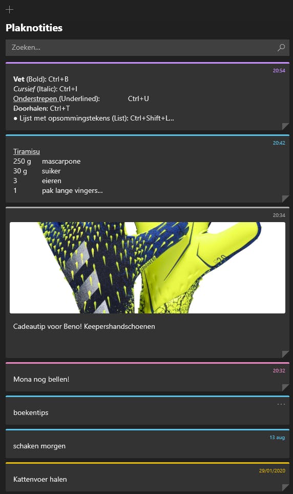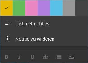 Plaknotities is voorgeïnstalleerd in het systeem. Je typt in het Start-menu de zoekopdracht Plaknotities en daar verschijnt de vertrouwde tool met onderaan de basisknoppen. Hiermee kun je tekst vet, cursief, onderlijnd en doorstreept opmaken. Daarnaast staat de knop om de opsommingstekens in- en uit te schakelen. En de laatste knop dient om een afbeelding in de notitie toe te voegen. Via het menu met de drie puntjes in de rechterbovenhoek kun je de notitie verwijderen of de lijst met alle notities bekijken. En met het pluspictogram in de linkerbovenhoek maak je een nieuwe plaknotitie. Dubbelklik op de balk van een notitie om die te maximaliseren, herhaal dit om de notitie te minimaliseren.