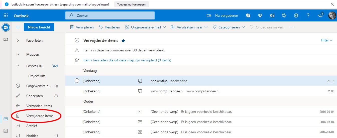 Als je er even niet met je hoofd bij bent, is het mogelijk dat je per ongeluk een notitie verwijdert. Je kunt dit gelukkig nog wel herstellen via een nogal ongebruikelijke weg. Je herstelt een plaknotities niet in het programma zelf, maar online in www.outlook.live.com. Daar moet je uiteraard alweer aanmelden met je Microsoft-account. In het linker menu kijk je in de groep Verwijderde items en daar zitten niet alleen de verwijderde e-mailberichten maar ook de verwijderde memo’s. Bovenaan lees je dat de items in deze map over dertig dagen worden gewist. Selecteer de notities die je wilt repareren, klik er met de rechtermuisknop op en kies daarna Herstellen. De herstelde plaknotities verschijnen nog niet automatisch op het bureaublad. Daarvoor moet je de app Plaknotities eerst afsluiten en opnieuw openen. Ga vervolgens naar de Lijst met notities en daar krijg je wel alle herstelde notities te zien. Dubbelklik op de notities zodat ze opnieuw op het bureaublad verschijnen. Als dat niet gebeurt, ga je over op plan B.