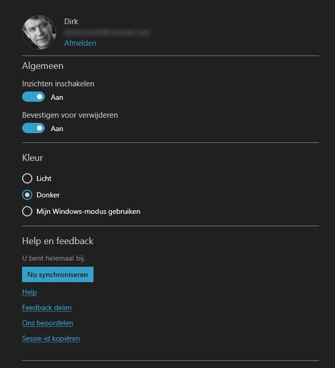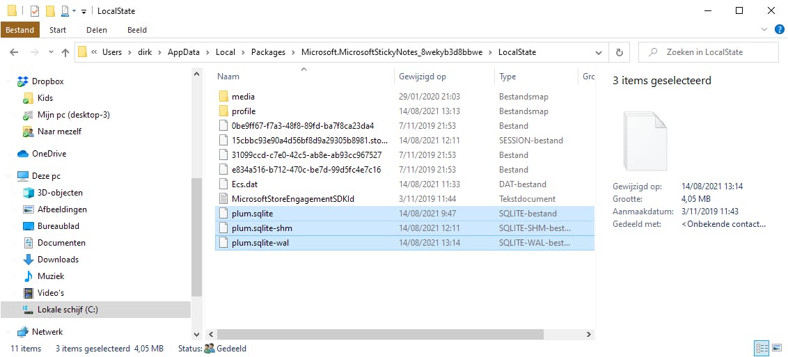 De meest voor de hand liggende en efficiënte manier om een back-up te maken van jouw plaknotities is met de ingebouwde synchronisatie van de app. Zorg dat je aangemeld bent bij Windows 10 met een actief Microsoft-account. Open de notities en synchroniseer. Er bestaat ook een meer ingewikkelde manier waarbij je een kopie maakt van de SQLite-databasebestanden. Je kunt de bestanden voor bewaring kopiëren naar elke andere map, externe schijf of online opslagservice. Open C:\Users\dirk\AppData\Local\Packages\Microsoft.MicrosoftStickyNotes_8wekyb3d8bbwe\LocalState en kopieer de drie bestanden: plum.sqlite, plum.sqlite-shm en plum.sqlite-wal . Plak deze op een veilige plaats. Als je deze drie later terug op hun locatie plaatst, beschik je weer over je vertrouwde notities op dezelfde computer of op een andere Windows 10-pc.
