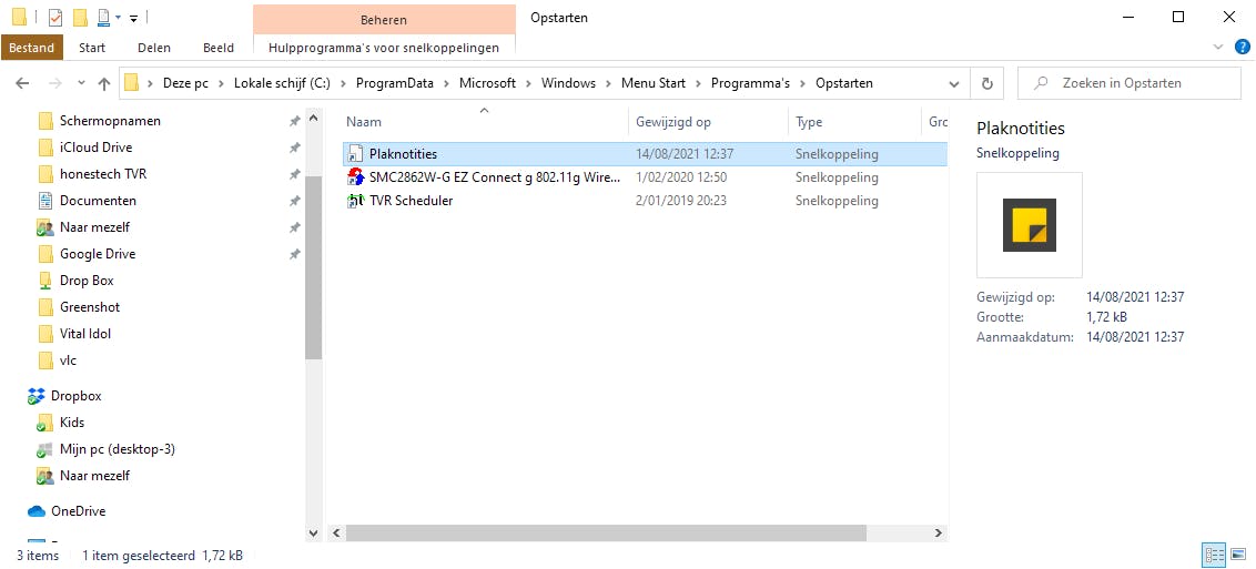 Als je wilt dat de plaknotities zichtbaar blijven als je de volgende keer opstart, dan laat je ze gewoon openstaan bij het afsluiten van de pc. Als je ze met Taakweergave op een virtueel bureaublad hebt geplaatst dan staan ze trouwens nooit in de weg. En natuurlijk is het mogelijk om de app toe te voegen aan de applicaties die samen met het systeem opstarten. Eerst maak je daarvoor een snelkoppeling van de app. Zoek de applicatie in het menu Start en sleep het pictogram op het bureaublad. Hierdoor zal het systeem automatisch een snelkoppeling maken. Vervolgens typ je in het zoekvlak bij Start de tekst %programdata%. De zoekfunctie toont een bestandsmap. Klik op Openen en ga verder in de map ProgramData\Microsoft\Windows\Menu Start\Programma’s\Opstarten of