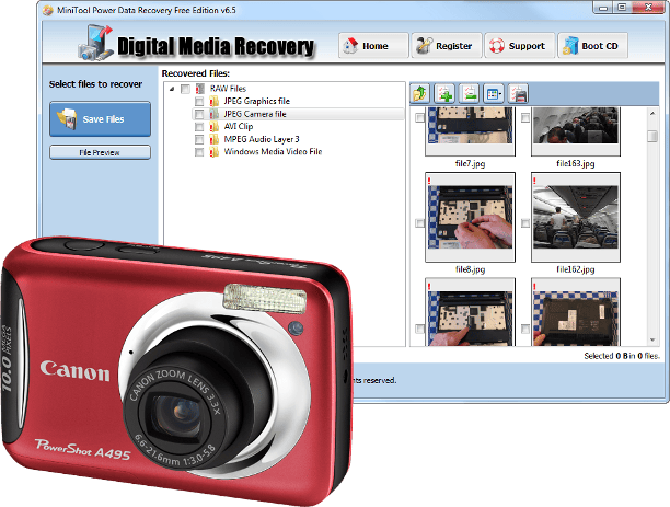 MiniTool Power Data werkt niet alleen op uw harde schijf, u kunt het programma ook loslaten op de geheugenkaart van uw digitale camera of op uw usb-stick. Hiermee worden foto's en filmpjes die ooit zijn gewist eenvoudig teruggevonden. Ook als een geheugenkaart niet meer leesbaar lijkt, kunt u met MiniTool Power Data proberen afbeeldingen en filmpjes terug te krijgen. Plaats de (defecte) geheugenkaart in de kaartlezer van uw computer. Start MiniTool Power Data, klik in het eerste scherm op Digital Media Recovery en geef aan welke schijfletter uw geheugenkaart heeft. Het zoek & herstelproces is nagenoeg hetzelfde. MiniTool Power Data toont een voorbeeldweergave van de bestanden die u mogelijk kwijt bent en maakt een onderverdeling tussen de aangetroffen bestanden, in mappen waar bijvoorbeeld jpg's, png's of filmbestanden in terechtklomen.