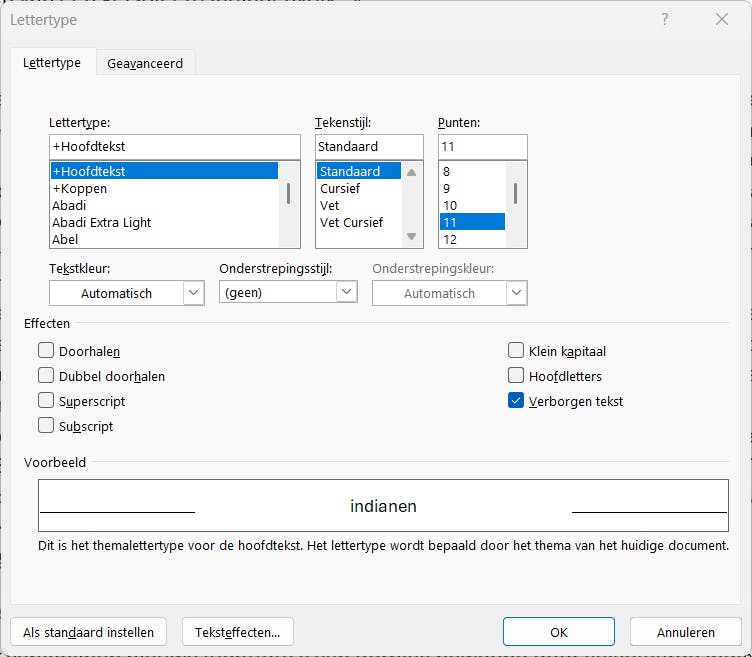 Om de tekst te verbergen, selecteer je eerst de inhoud die je tijdelijk aan het oog wilt onttrekken. Daarna open je het lettertype-dialoogvenster. Dat kan door met de rechtermuisknop op de tekstselectie te klikken en de opdracht Lettertype te kiezen. Of je gebruikt simpelweg de toetscombinatie Ctrl+D. In dit dialoogvenster zet je onder Effecten een vinkje bij de eigenschap Verborgen tekst. Of nog sneller: selecteer de tekst die je wilt verbergen en gebruik de combinatie Ctrl+Shift+H (met de H van hide). Hierdoor verdwijnt de tekst uit beeld. Er zal ook geen extra witruimte te zien zijn.
