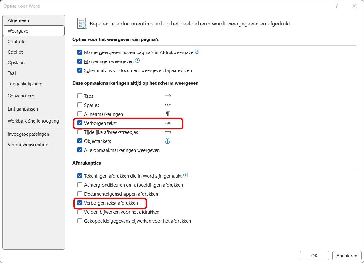 Ten slotte zit er een optie in Word om verborgen tekst altijd te tonen. Ga daarvoor naar Bestand, kies Opties en selecteer in de linkerkolom Weergave. Je kunt nu met een vinkje aangeven dat je verborgen tekst altijd op het scherm wilt zien. Daaronder bij de Afdrukopties is het mogelijk om in te stellen dat je verborgen tekst altijd wilt afdrukken. Die twee opties zijn niet de standaardinstelling.