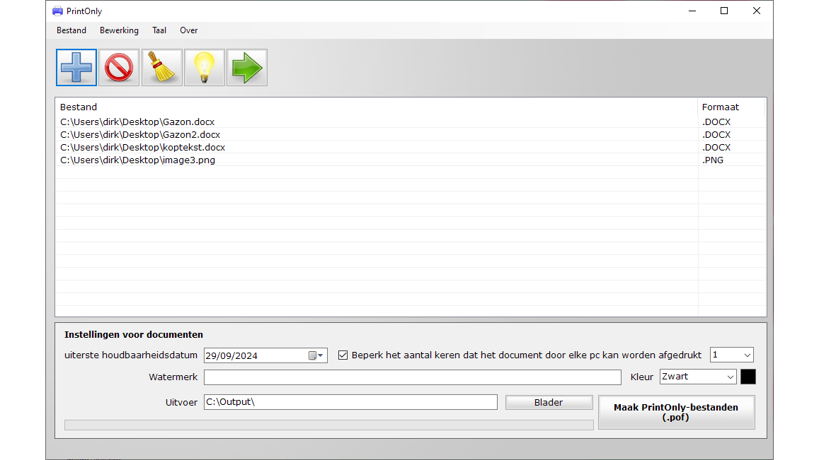 PrintOnly is een gratis Windows-tooltje dat je vindt op www.printonly.net. Het is gemaakt om bestanden om te zetten naar het print-only-formaat. Nadat de software is geïnstalleerd, sleep je de documenten naar de bestandenlijst. Dat kunnen pdf-bestanden zijn, maar ook bijvoorbeeld Word-, Excel-, PowerPoint-, Open Document- of Photoshop-bestanden. Je kunt verschillende bestanden tegelijk in batch laten verwerken tot print-only-bestanden. Het programma werkt in het Nederlands.