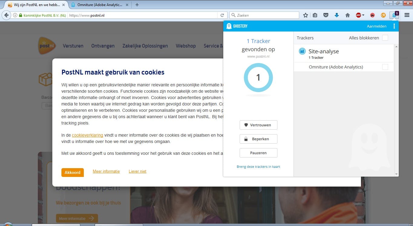 Nog voordat je toegang krijgt tot de website de site van PostNL wordt er tijdens het tonen van de cookieverklaring al een trackingcookie van Adobe Analytics op je computer geplaatst. Je pseudo-geanonimiseerde zoekgeschiedenis, locatiegegevens en klikgedrag worden vanaf dat moment geanalyseerd.