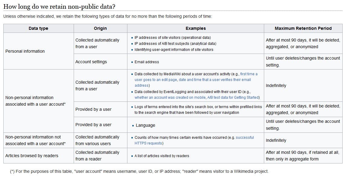 Daarnaast worden onder andere je taalinstelling, naam van de provider, de website waar je vandaan kwam, de pagina’s die je bezoekt en de datum en tijd van het bezoek opgeslagen. Wikipedia geeft een helder overzicht van het gegevensbeleid en de bewaartermijnen, maar zou kunnen overwegen bepaalde gegevens zoals e-mailadressen en accountgegevens eerder te verwijderen. Deze worden in de huidige situatie namelijk niet weggehaald na verloop van tijd.