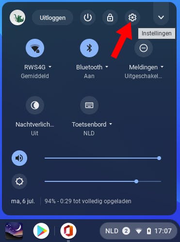 Klik daarvoor om te beginnen op het blokje rechts onderin beeld (met onder meer de klok). Klik vervolgens op het instellingen-tandwieltje in het geopende paneel. Je ziet nu een venster met links diverse categorieën en rechts een paneel met al die dingen op een rijtje. Klik om te beginnen eens onder Mensen op Synchronisatie en Google-gegevens.
