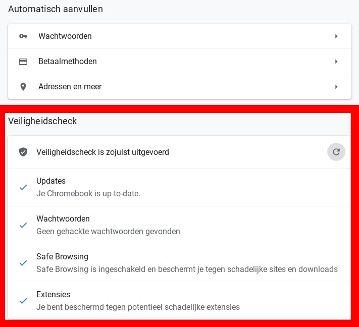 We zijn er nog niet. De centrale spil van elke Chromebook is Chrome browser. En je raadt het al: ook die heeft z´n eigen instellingen. Start Chrome en klik daarin op de knop met de drie onder elkaar geplaatste puntjes helemaal aan de rechterkant van de standaardwerkbalk bovenaan. In het daarop geopende menu klik je op Instellingen. Onder Jij & Google (menu links) vind je weer wat – inmiddels al deels bekende – privacy-gerelateerde zaken zoals bijvoorbeeld een wachtwoordenbeheerder en beheer van betalingsgegevens. Verder kun je een veiligheidscheck uit laten voeren, doe dat met enige regelmaat om ellende te voorkomen. Onder Privacy en beveiliging (kolom links wederom) vind je diverse interessante zaken, waaronder de mogelijkheid om cookies te beheren en tonen alsmede de mogelijkheid om je browsercache te wissen.