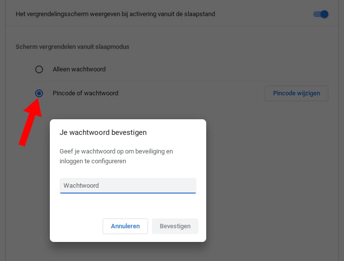 En nu je toch op dit scherm bent aanbeland: zorg zeker ook dat de schakelaar achter Het vergrendelingsscherm weergeven bij activering vanuit de slaapstand aan, om overduidelijke reden.
