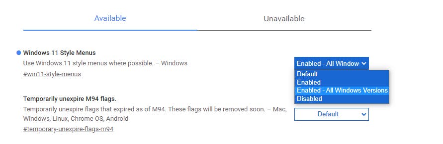 Ga nu naar chrome://flags/#win11-style-menus om de optie Windows 11 Style Menus te zien. Kies hier voor Enabled als je al op Windows 11 zit, of Enabled - All Windows Versions als je nog Windors 10 draait. Klik op Relaunch om je keuze door te voeren.