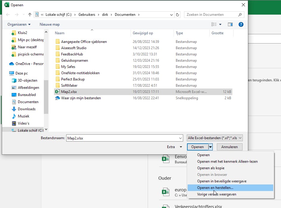 Excel heeft ook een eigen reparatieprogramma. Open daarvoor Microsoft Excel. Vervolgens klik je op de optie Openen in de linkerzijbalk en selecteer je Bladeren. Navigeer naar de locatie waar het corrupte Excel-bestand zich bevindt. Selecteer het en klik op de pijl-omlaag naast de knop Openen. Daar kies je Openen en herstellen. Selecteer nu nogmaals de optie Herstellen. Dit proces kan even duren, afhankelijk van het aantal gegevens dat het bestand bevat. Als het herstel is afgerond, zal Excel het bestand automatisch openen.