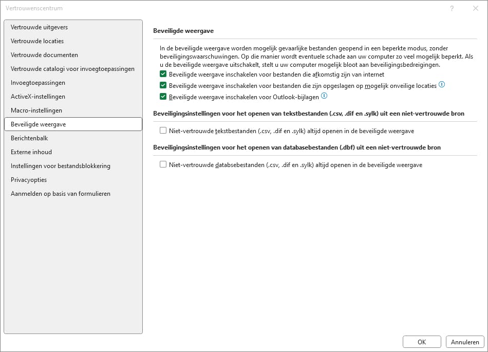 Microsoft Excel bevat een ingebouwde beveiliging die risicovolle bestanden in een beperkte modus opent. Wanneer het programma ervan uitgaat dat het bestand mogelijk onveilig is, zal het weigeren om het te openen. Ben je er echter zeker van dat het bestand veilig is, dan kun je deze functie uitschakelen. Selecteer Opties in de linkerzijbalk en open het Vertrouwenscentrum. Daar kies je aan de rechterkant Instellingen voor vertrouwenscentrum. In het volgende scherm selecteer je aan de linkerkant Beveiligde weergave. Standaard zijn daar drie opties aangevinkt waardoor de beveiligde weergave wordt ingeschakeld: bij bestanden van het internet, bij bestanden die werden opgeslagen op onveilige locaties en bij Outlook-bijlagen. Haal die drie vinkjes weg en klik op OK. Als de problemen werden veroorzaakt door het Vertrouwenscentrum, dan moet je deze bestanden nu alsnog kunnen openen.