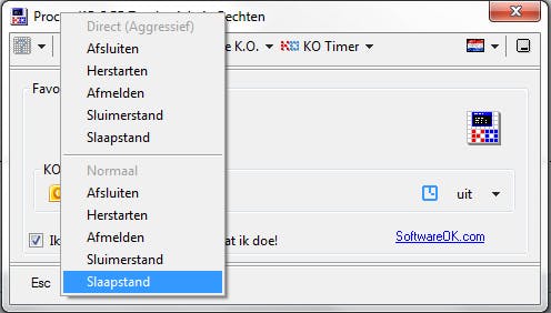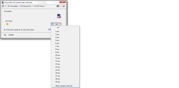 Een handige optie van ProcessKO is de mogelijkheid om het afsluiten van processen te koppelen aan een timer. U voegt het proces dan toe aan een wachtrij en selecteert hoeveel seconden het programma moet wachten voordat het proces daadwerkelijk wordt afgesloten. Daarnaast bevat het programma nog wat opties die we kennen uit het menu Start, zoals afsluiten, opnieuw opstarten enzovoort, met als grote verschil dat dit op een normale of agressieve manier kan gebeuren. Agressief betekent dat de pc niet kan blijven hangen omdat een proces niet meewerkt.