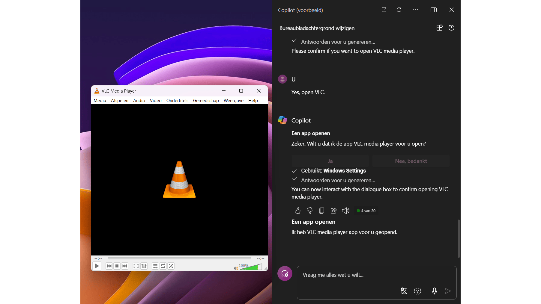 Wel kan de AI-assistent vrijwel elke app starten die op je computer is geïnstalleerd zonder dat je langs het startmenu hoeft. Open Copilot, klik in het vak Vraag me alles wat u wilt en schrijf een opdracht. Zo’n tekstopdracht noemen we een prompt, bijvoorbeeld Open VLC. Copilot maakt de vraag wat preciezer: Wilt u dat ik de app VLC media player voor u open? Klik op Ja en de gevraagde app verschijnt meteen op het bureaublad. De chatbot reageert zo veel mogelijk op natuurlijke taal. Je kunt dus bijvoorbeeld net zo goed Start VLC typen.