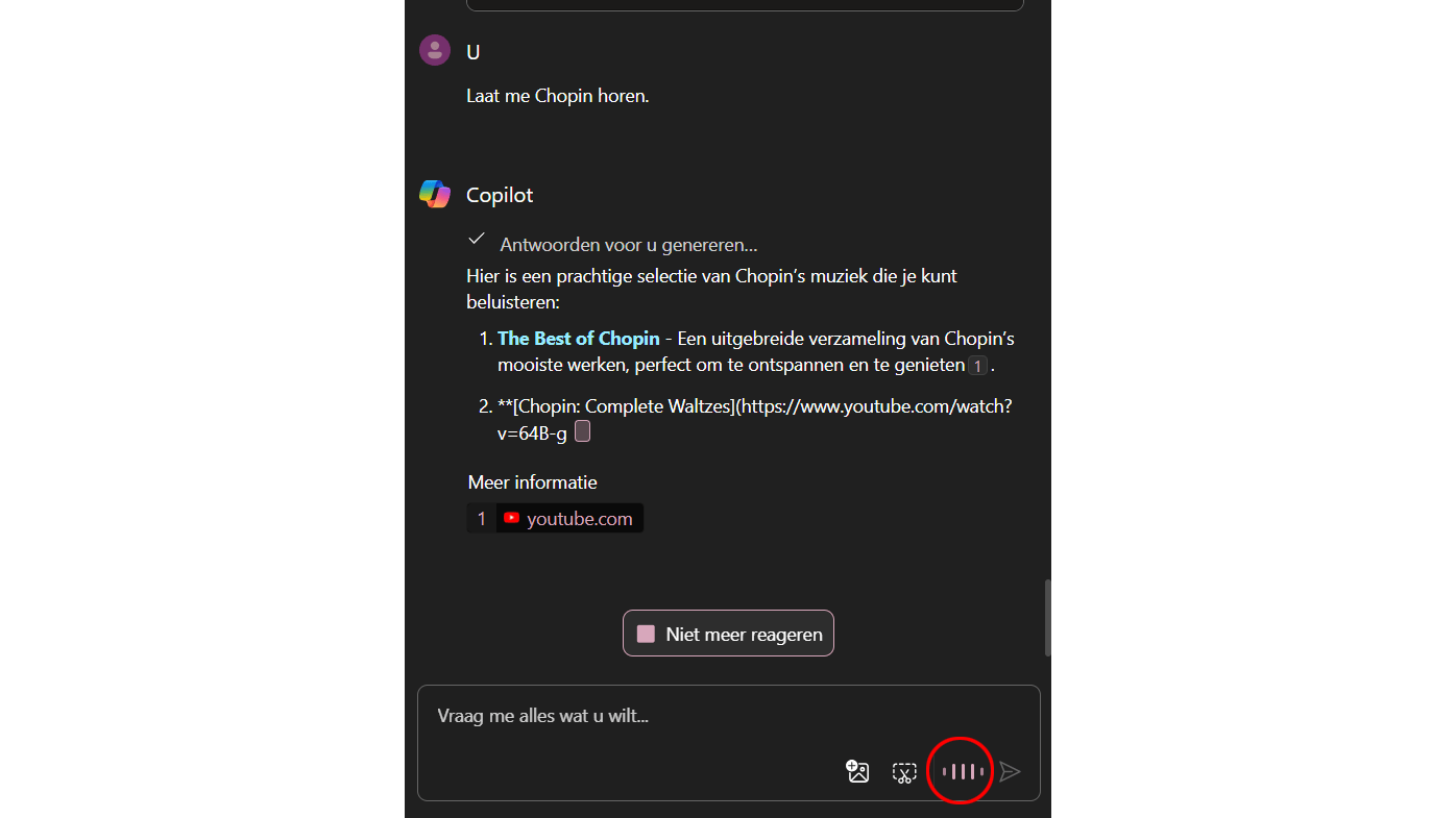 In plaats van te typen kun je ook opdrachten inspreken. Daarvoor klik je op het pictogram van de microfoonknop. Copilot reageert op deze ingesproken prompts zelf ook met spraak. De chatbot ondersteunt sinds april 2024 officieel het Nederlands, zowel in schrijf- als in spraakopdrachten. Nadat je op het microfoontje hebt geklikt verschijnt in het promptvak de uitnodiging Ik luister. De chatbot genereert een antwoord en terwijl hij spreekt zie je een kleine animatie in de rechterbenedenhoek.